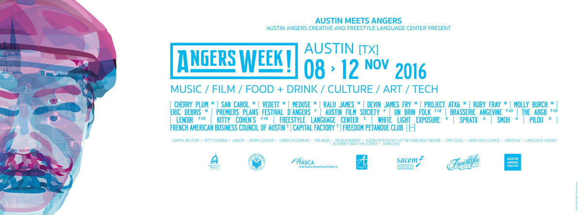 Si vous êtes en vacances du côté d’Austin en Novembre ou que vous avez des amis texans, n’oubliez pas que la Angers Week se tiendra chez nos amis américains du 8 au 12 Novembre. Sur le même modèle que la Austin Week d’il y a quelques semaines à Angers, ces cinq jours seront alors l’occasion de présenter aux Austinites quelques fleurons de notre culture locale (musique, cinéma, gastronomie, etc.). Parmi les groupes angevins à faire le déplacement, Cherry Plum, San Carol, VedeTT (tous trois de l’Equipe Espoir Chabada-2016) et Méduse. Enjoy your trip!