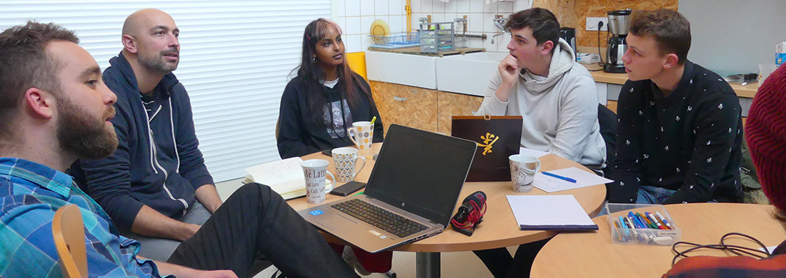 Crédit photo : Report’Cité – L’Usine, l’espace jeunes du Centre social du Chemillois, a accueilli un premier temps d’échange entre Sally, artiste de l’Equipe espoirs du Chabada et sept jeunes reporters encadrés par l’association Report’Cité et Esteban, animateur au centre social.