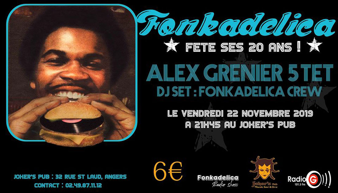 Si vous aimez le funk, la soul, le hip hop, le jazz ou la disco, il y a fort à parier que depuis 20 ans vous avez déjà écouté la mythique émission Fonkadelica sur les ondes de Radio G!. Pour ce vingtième anniversaire, l’équipe de Fonkadelica investit donc le Joker’s Pub le 22 novembre et invite leur pote Alex Grenier à venir faire la grosse bamboule avec eux. Programme archi-grooovy donc qui finira bien entendu en sueur sur le dancefloor!