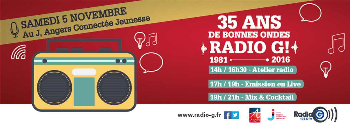 Toute l’équipe de Radio G! vous donne donc rendez-vous le samedi 5 Novembre au « J, Angers  Connectée Jeunesse » (12 place Imbach) entre 14h00 et 21h00 pour une foultitudes d’activités radiophoniques et festives.